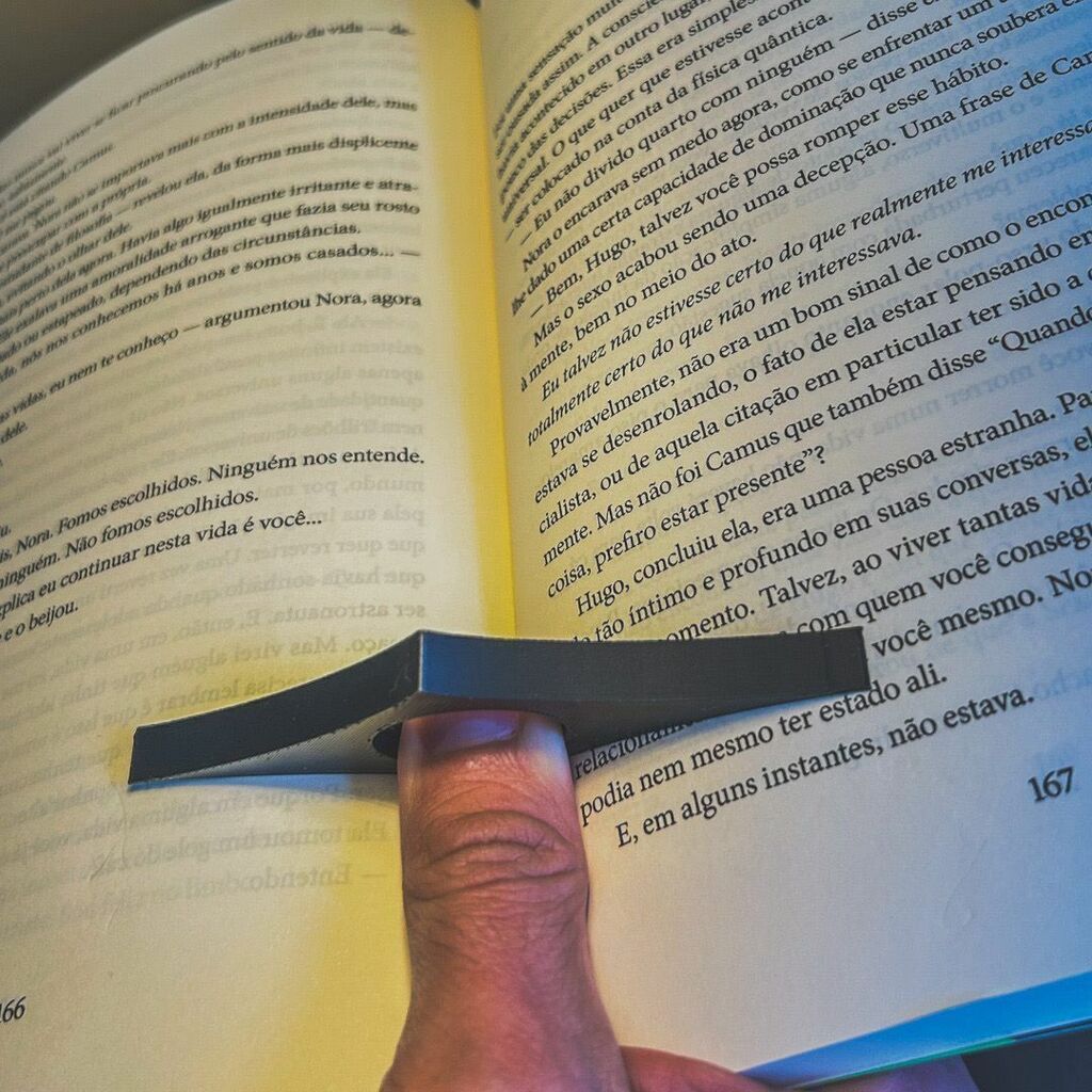 O anel de leitura Saramago é aquele solução do design simples e funcional. Leve, pequeno e básico, com ele você segura um livro com uma mão, sem precisar dobrar nem amassar nada.