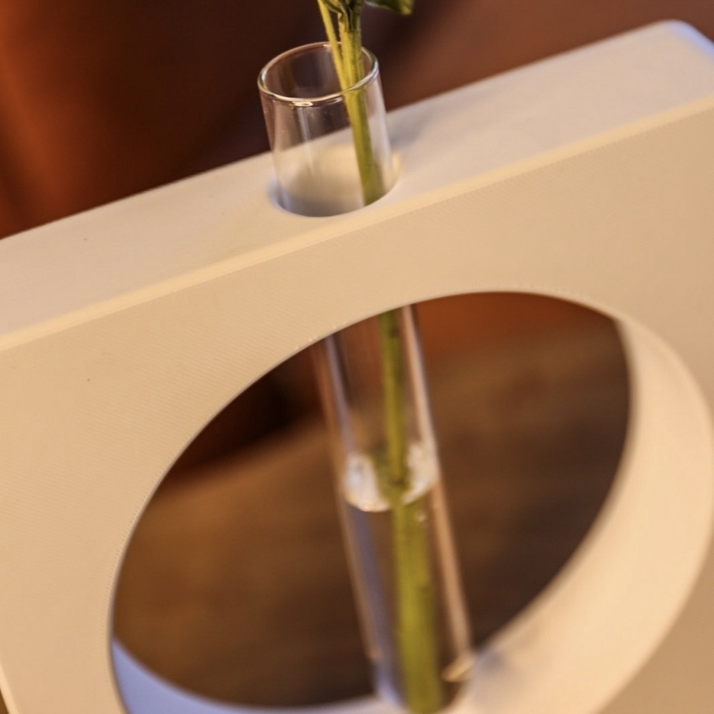 O vaso Orbe tem no minimalismo e na mistura de materiais seu charme. Feito em PLA (um bioplástico feito de cana de açúcar e amido de milho) e com um tubo de ensaio em vidro, ele une a simplicidade à elegância.